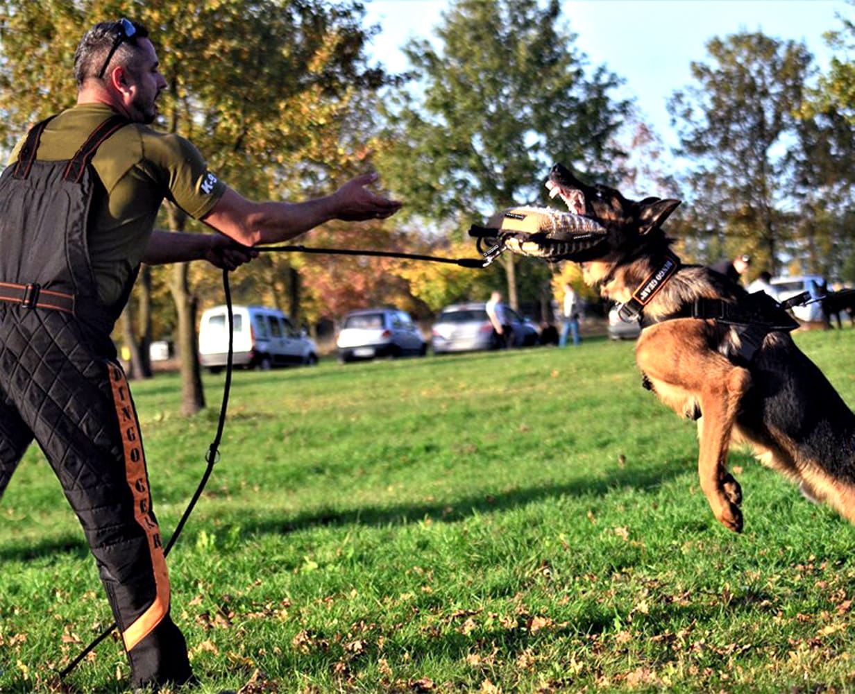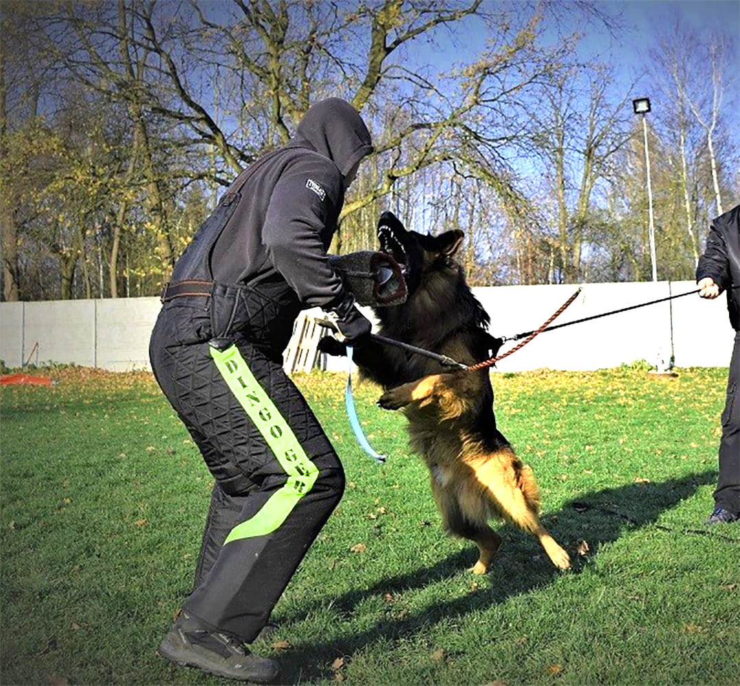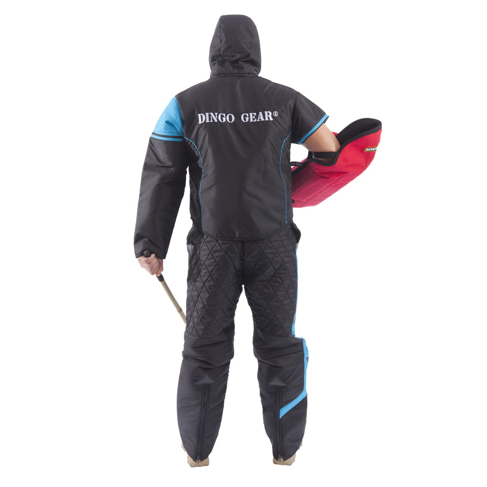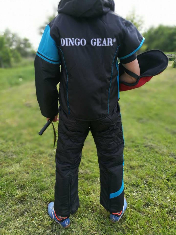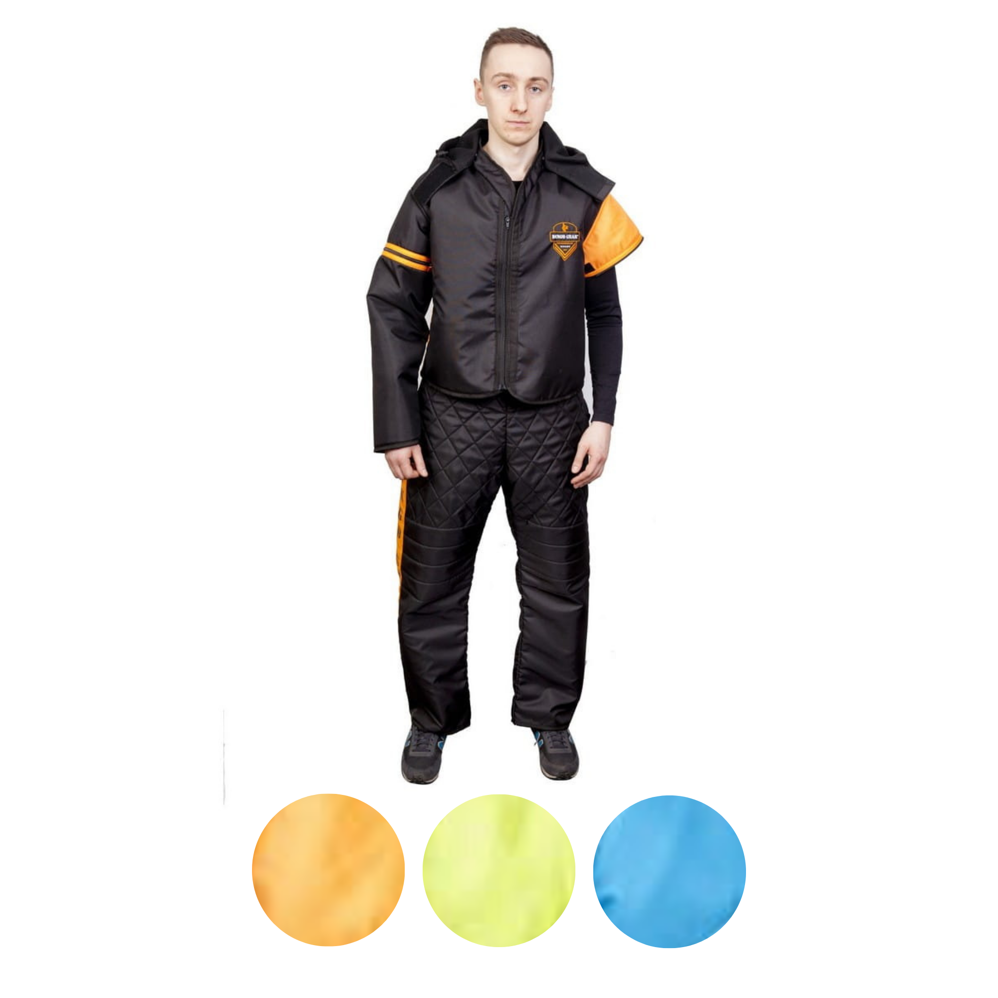 Super lekkie ubranie dla pozoranta składa się z kurtki i spodni. Kostium nie krępuje ruchów pozoranta co pozwala na bardzo efektywną pracę z psem. Kurtka zapinana na zamek YKK posiada kaptur ze sznurowaniem oraz jeden rękaw (przypinany na zamek), który można dopiąć na lewą lub prawą rękę. Kaptur i rękaw można odpiąć dzięki czemu kurtka staje bezrękawnikiem. Spodnie mają fason ogrodniczek, w których nogawki są pikowane oraz mają zapięcia na łydkach co ułatwia ich zakładanie bez zdejmowania butów. Szelki wykonane z miękkiej gumy posiadają regulację długości. Kurtka i spodnie zostały wyposażone w kieszenie, w których można przechowywać różne drobiazgi. Ubiór dla pozoranta wykonaliśmy ręcznie z precyzją, aby użytkownicy uzyskali właściwy komfort podczas treningów.