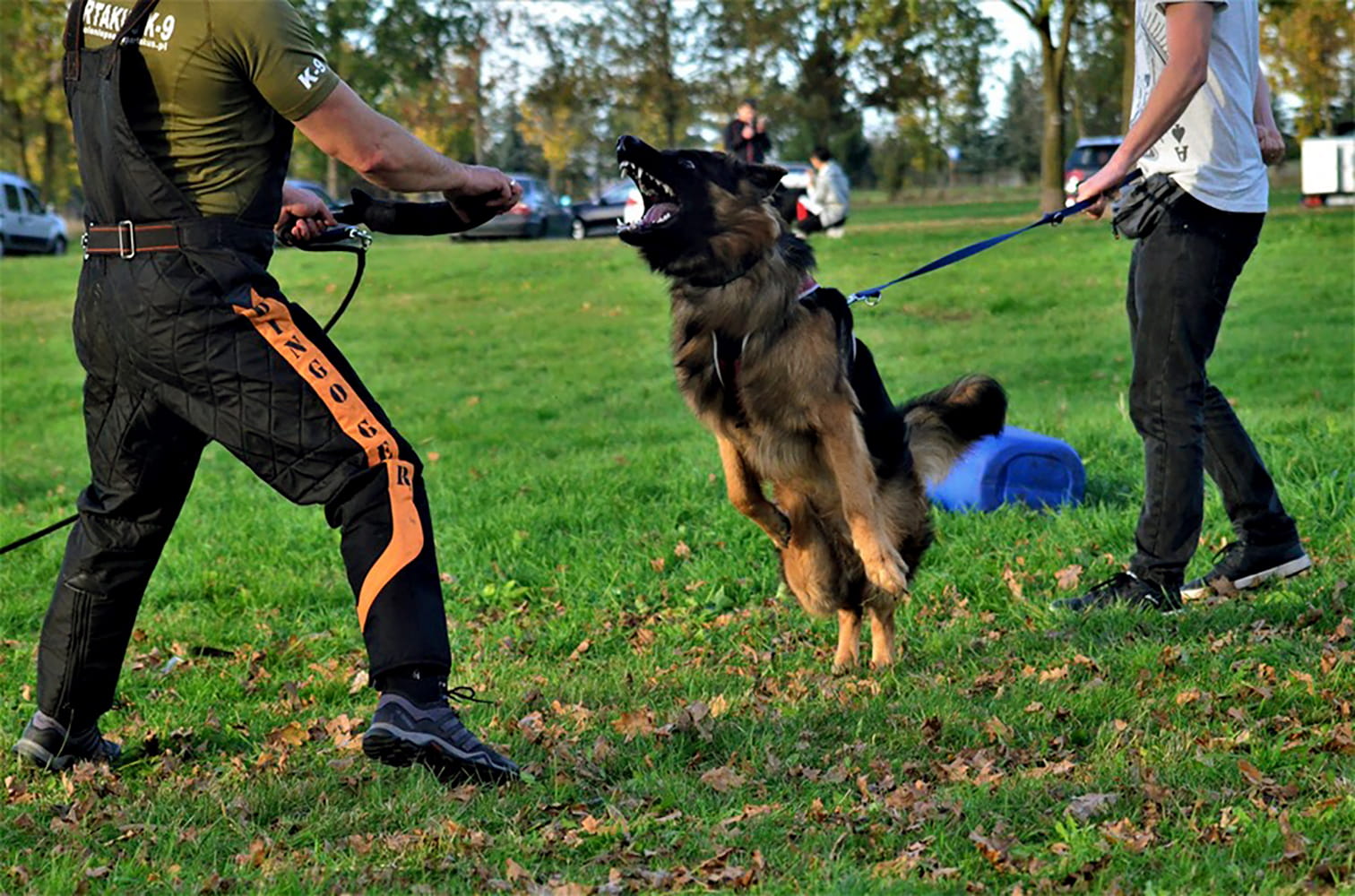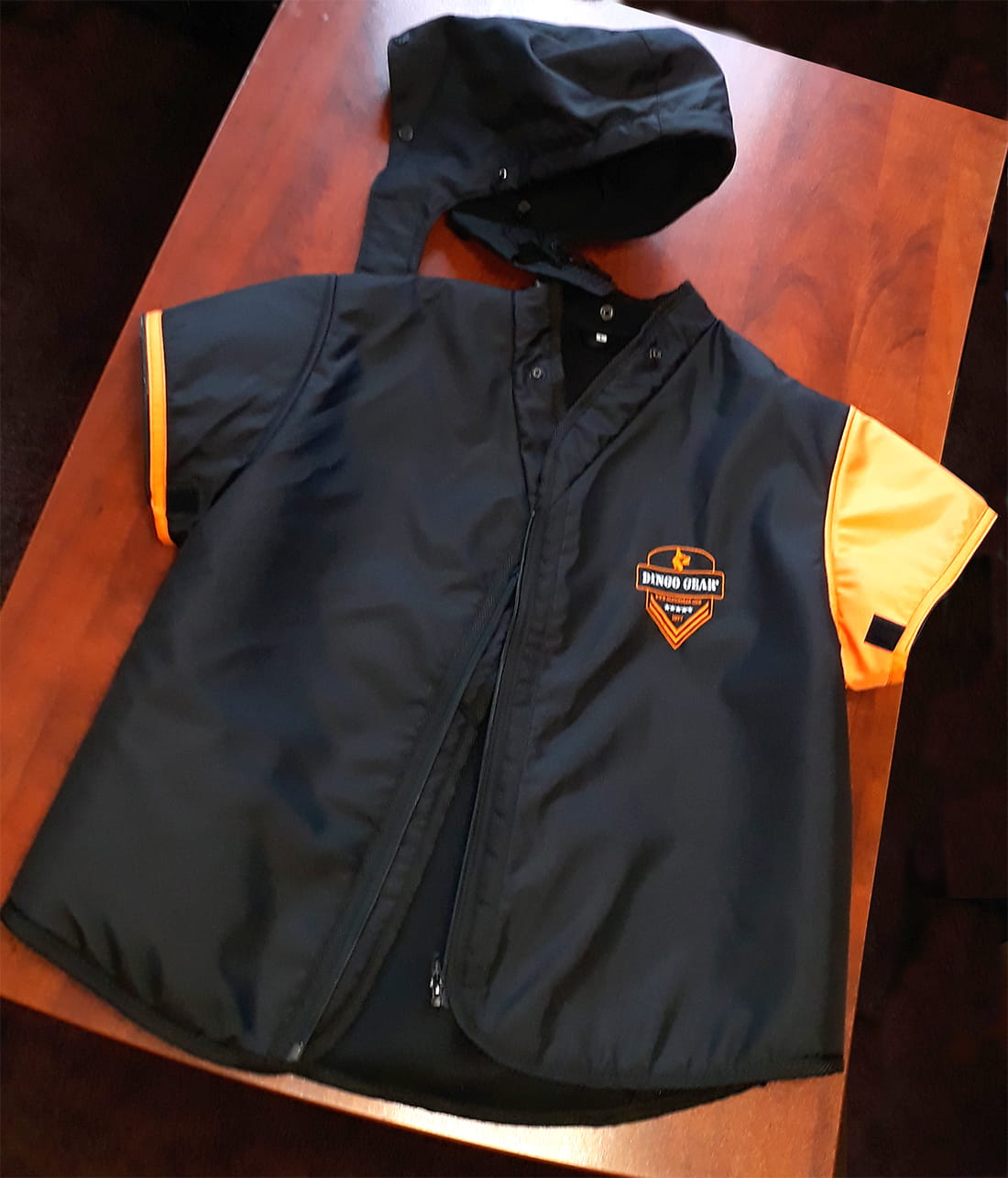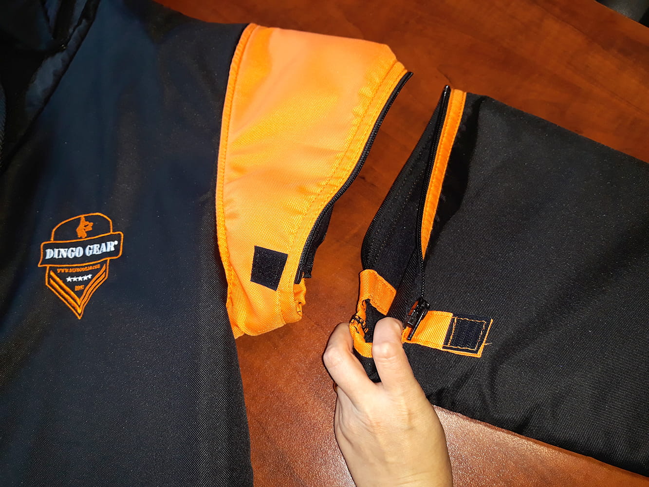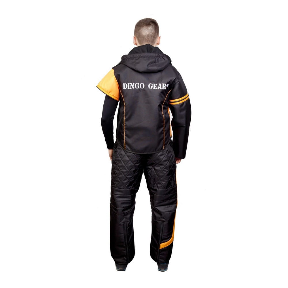 Super lekkie ubranie dla pozoranta składa się z kurtki i spodni. Kostium nie krępuje ruchów pozoranta co pozwala na bardzo efektywną pracę z psem. Kurtka zapinana na zamek YKK posiada kaptur ze sznurowaniem oraz jeden rękaw (przypinany na zamek), który można dopiąć na lewą lub prawą rękę. Kaptur i rękaw można odpiąć dzięki czemu kurtka staje bezrękawnikiem. Spodnie mają fason ogrodniczek, w których nogawki są pikowane oraz mają zapięcia na łydkach co ułatwia ich zakładanie bez zdejmowania butów. Szelki wykonane z miękkiej gumy posiadają regulację długości. Kurtka i spodnie zostały wyposażone w kieszenie, w których można przechowywać różne drobiazgi. Ubiór dla pozoranta wykonaliśmy ręcznie z precyzją, aby użytkownicy uzyskali właściwy komfort podczas treningów.